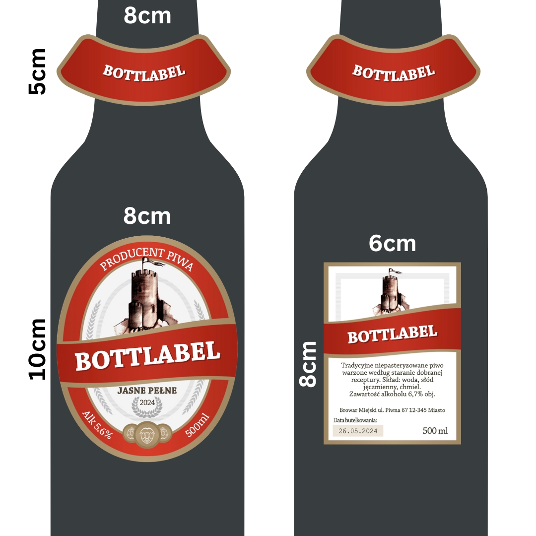 - Przednia etykieta 8x10cm – na informacje o Twoim piwie m.in. nazwa, styl, zawartość alkoholu, data butelkowania)
